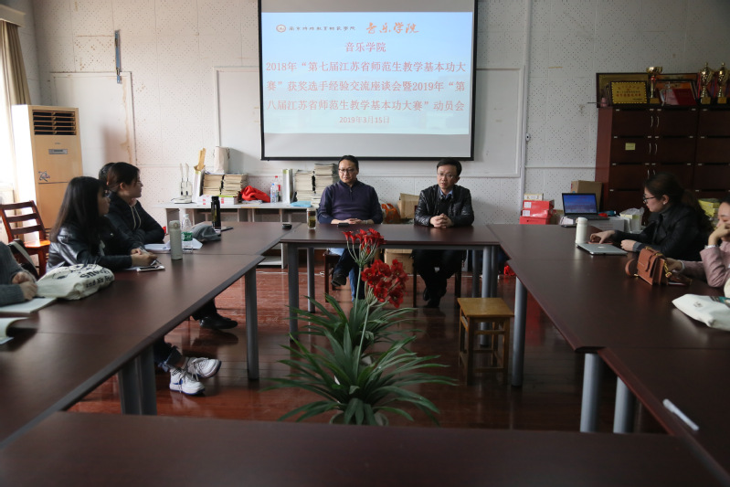 2019年3月15日中午十二点半,音乐公司2018年“第七届江苏省师范生教学基本功大赛”获奖选手经验交流座谈会暨2019年“第八届江苏省师范生教学基本功大赛”动员会在博韵楼209举行。会议由张强副经理主持,参会的有党总支书记杨荔、理论教研室陈学东主任、赵芸禾老师、第七届省师范生基本功大赛获奖员工沈意媚、石文,以及音乐公司即将参加第八届省师范生基本功大赛的16级同学们。