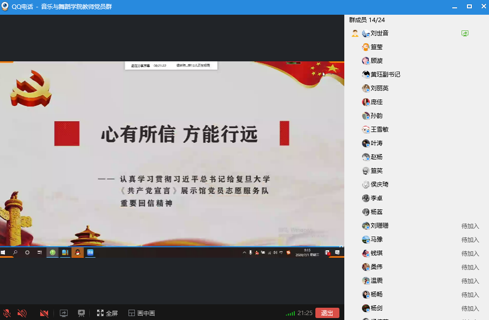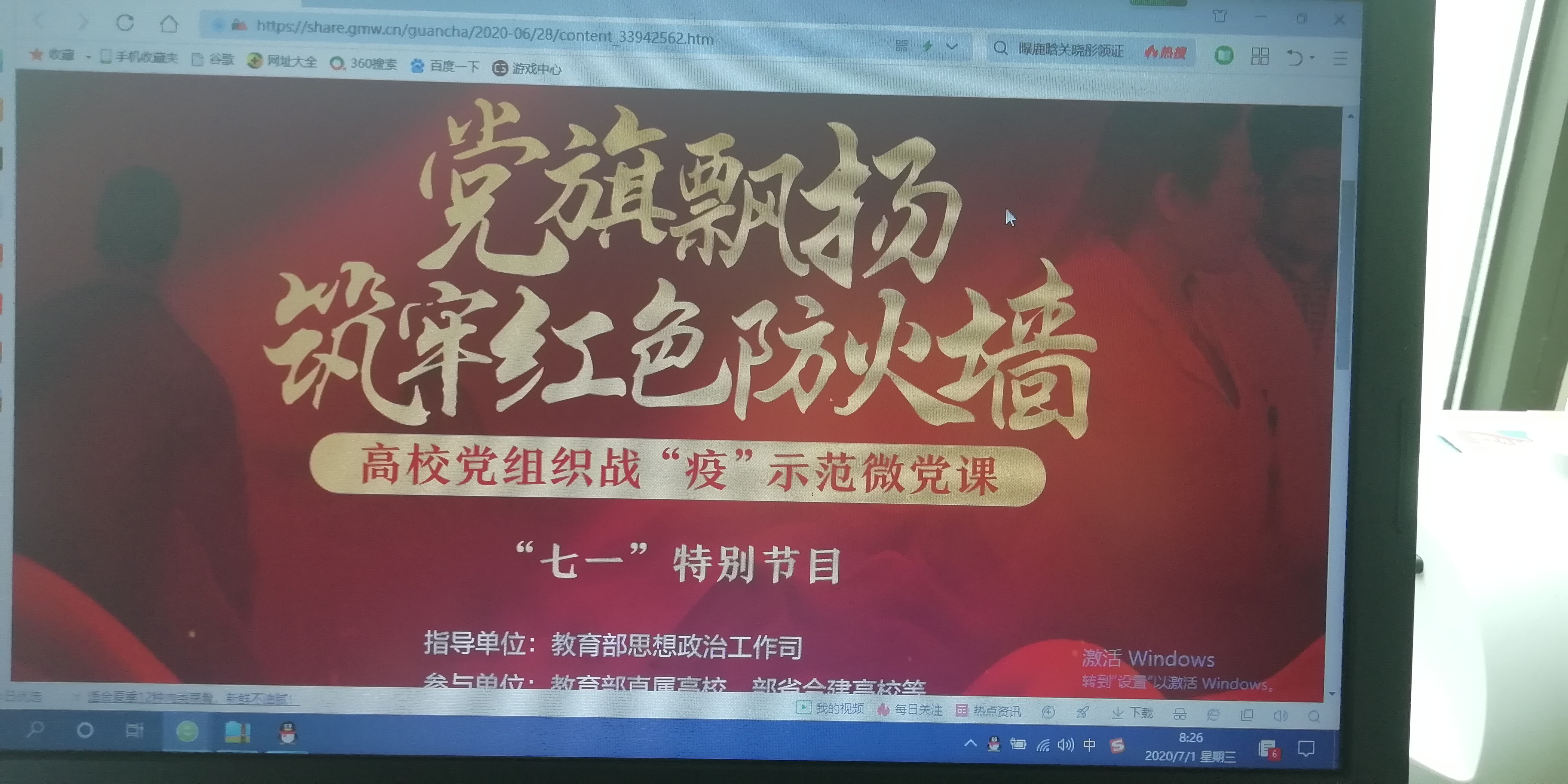 2020年7月1日是我们党建党99周年的纪念日。在这个特别的日子里,上午九点,BETVLCTOR伟德国际1946教师党支部的老师们齐聚在党支部的QQ群里,在线上共同观看由教育部思政司指导组织开展的 “党旗飘扬,筑牢红色防火墙”高BETVLCTOR伟德国际1946党组织战“疫”示范微党课“七一”特别节目的网上直播。