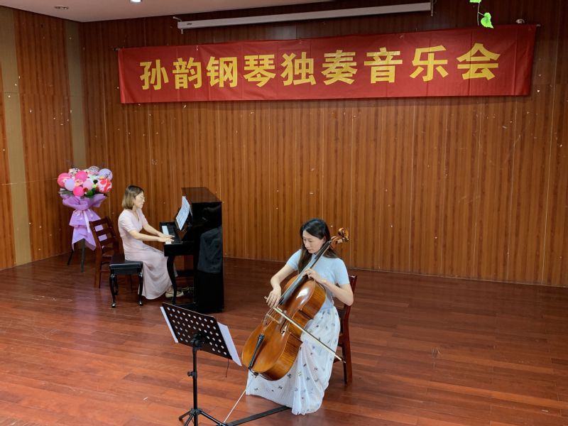 下半场首先由孙韵老师指导的2018级二位员工进行表演,江雯演奏的《F大调华丽圆舞曲》(又名《小猫圆舞曲》),轻快活泼,充满热情,犹如跳到琴键上的顽皮猫咪;孙美奇演奏的《特罗尔豪根的婚礼日》选自格里格的抒情钢琴曲集,描绘婚礼之日宾客云集,热闹喜悦的气氛,充满挪威民间音乐风格。孙韵老师指导的二位员工凭借娴熟的基本功和扎实的演奏技巧,为音乐会锦上添花。音乐会最后两首作品是由孙韵老师与王晓莹老师合奏圣桑的《天鹅》和久石让的《季节的回转》,钢琴的浪漫与大提琴的低沉婉转融为一体,古典乐与现代乐的碰撞将音乐会推向了最高潮,获得全场观众热烈的掌声。