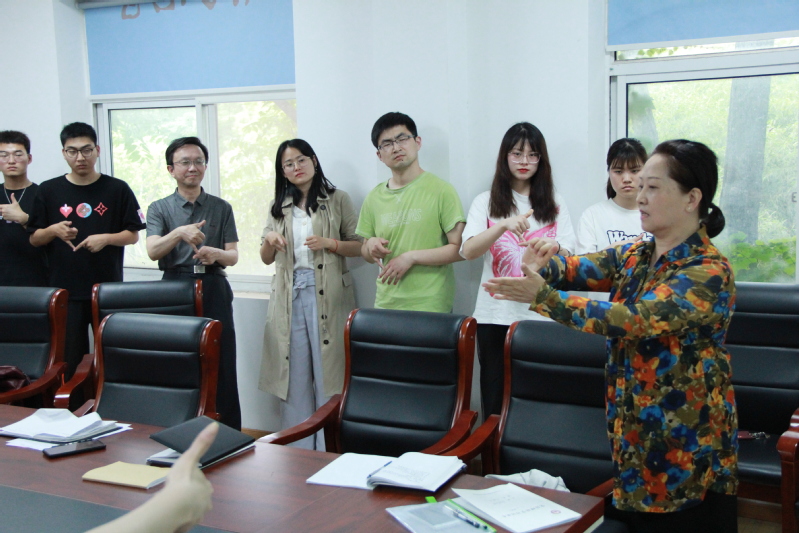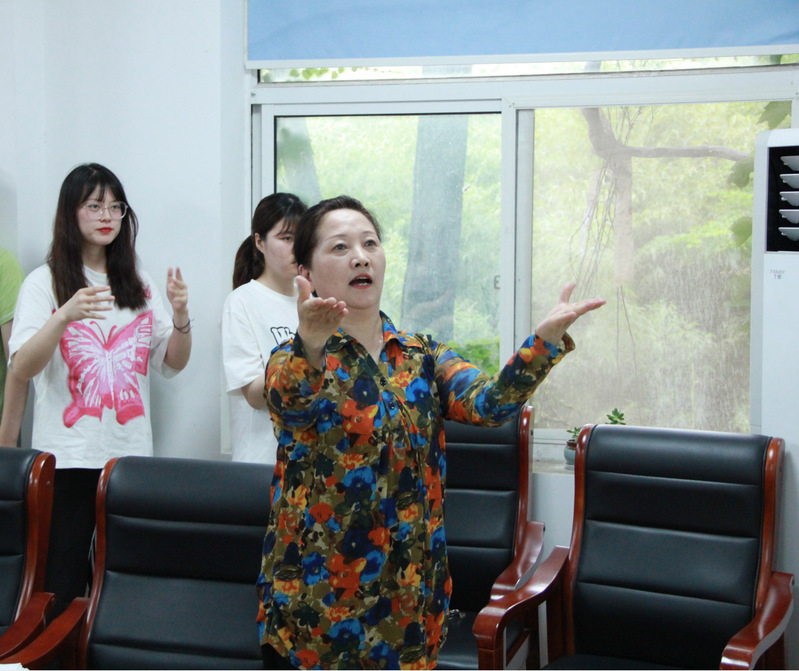 在提问环节,刘丽英教授用生动的教学案例来回答同学们在教学方法方面的难题。刘教授还带领与会师生一起用手语歌曲形式演唱《不忘初心》《义勇军进行曲》,大家声情并茂,通过指尖表达深深的爱国爱党情怀,歌曲结束后大家久久未能走出那振奋人心的“前进”旋律。