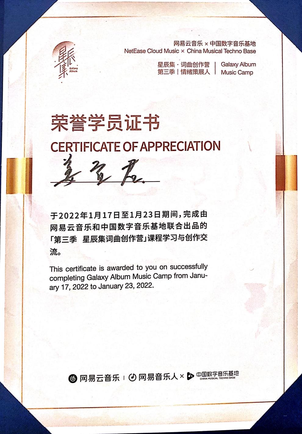 在营期间,15名学员经过三天的词曲课程和四天的集中创作,以小组为单位创作出了5首符合主题的音乐作品。结营典礼上,驻地导师陈耀川、杭州钱江世纪城管委会投促局副局长申旖琳为所有学员颁发了结营荣誉证书。