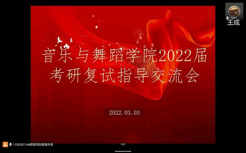 最后发言的是现于南京师范大学在读研究生孙宇航。他以当年复试题目为出发点,给大家带来经验的分享。复试第一项为专业作品表演、第二项为英文知识问答、第三项为专业知识问答。他强调面试自信、独立思考的重要性,选取院校与专业前要详细了解、制定复习计划、调整面试心态,并且建议同学们不要只局限于与专业相关的书籍,应多读不同类型的书,以便从容应对面试中的任何考题。