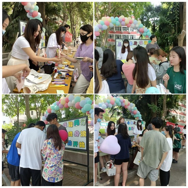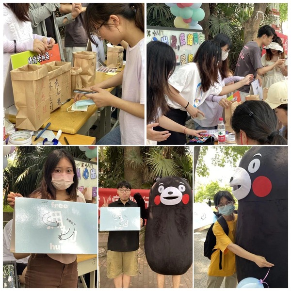 接下来活动正式开始。“烦恼碎碎箱”的设置让同学们在撕碎烦恼的同时,给心灵松松绑,给生活减减压。“情绪转换器”引导更多同学保持积极正面的情绪,乐观面对生活。“free hug”通过与玩偶的拥抱传递了温暖与爱。“夸夸树”呼吁同学们要善于发现自己身上的优点,美好都藏于生活的琐碎之中,要拥有一双发现美的眼睛。与“暖阳公益”合作的帆布袋活动,更是让同学们在通过绘画治愈自己的同时,也向那些需要帮助的人们传递了善意与温暖。同学们积极参与,在活动中感受、抒发自己的情绪,并留下积极乐观的心态去面对未来学习及生活中的种种困难。在这草木茵茵的五月,同学们跟着初夏的脚步一起共赴了这场‘5.25’的约会。