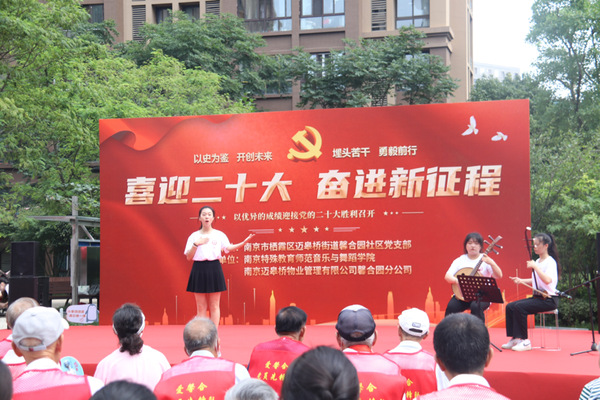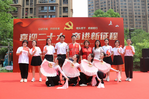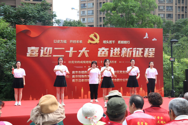 由许容嘉、孙瑞祺、李倩、孟佳依、徐子瑜、冯佩瑶带来的器乐演唱歌曲串烧《灯火里的中国》《不忘初心》《我的祖国》展现了当代老员工紧跟党的步伐、勇担强国使命的精神风貌,观众们深受感染,掌声不断。紧接着是社区舞蹈队带来的《领航》,最后演出在全场齐唱歌曲《没有共产党就没有新中国》中落下帷幕,高亢激昂、催人奋进的旋律将现场气氛推向了高潮,坚定了大家永远跟党走、奋进新征程的信心信念。