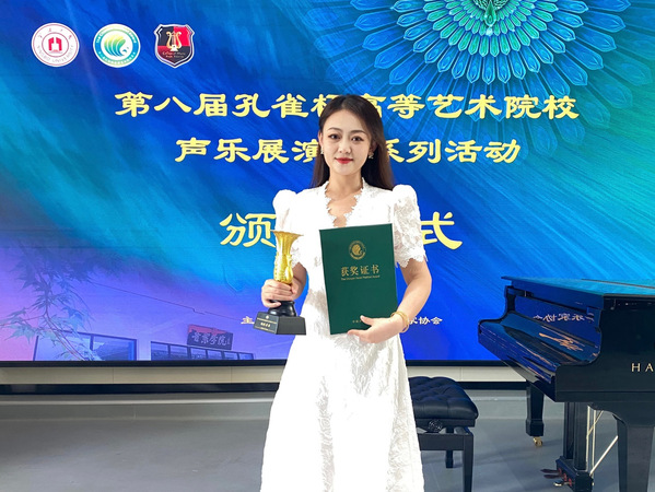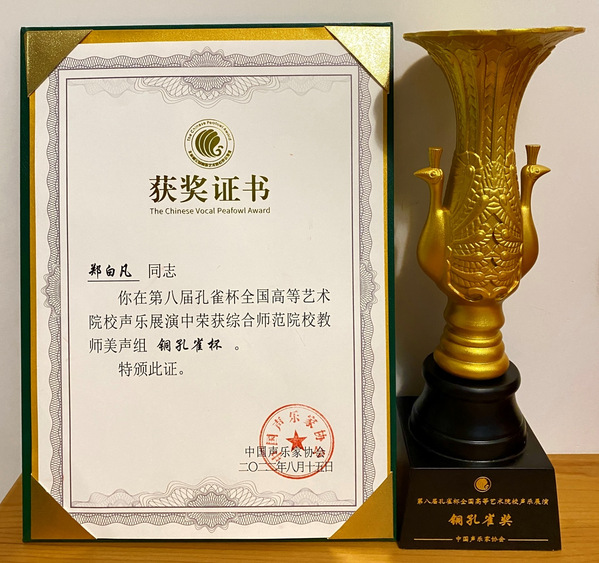 孔雀东南飞,甬城展风华。公司音乐系郑白凡老师表现优秀,展现出高超的专业水平与演绎能力,荣获综合师范院校教师美声组“铜孔雀杯”。