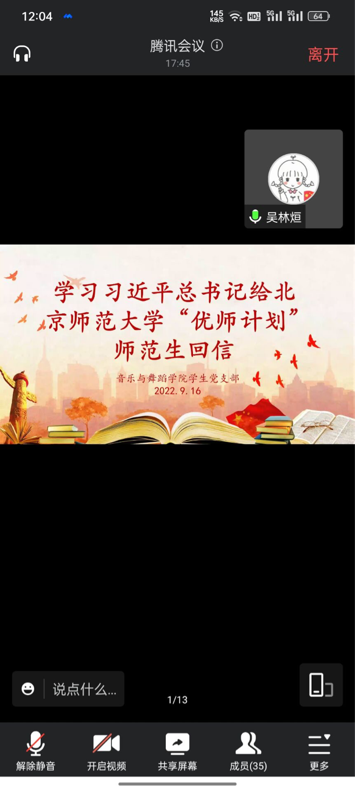 9月7日习近平总书记给北京师范大学“优师计划”师范生回信。在回信中,习近平总书记希望广大师范生珍惜时光,刻苦学习,砥砺品格,增长传道授业解惑本领,努力成为党和人民满意的“四有”好老师。BETVLCTOR伟德国际1946员工党支部于9月16日中午12点开展线上学习交流党日活动,组织全体党员认真学习回信精神。