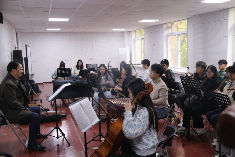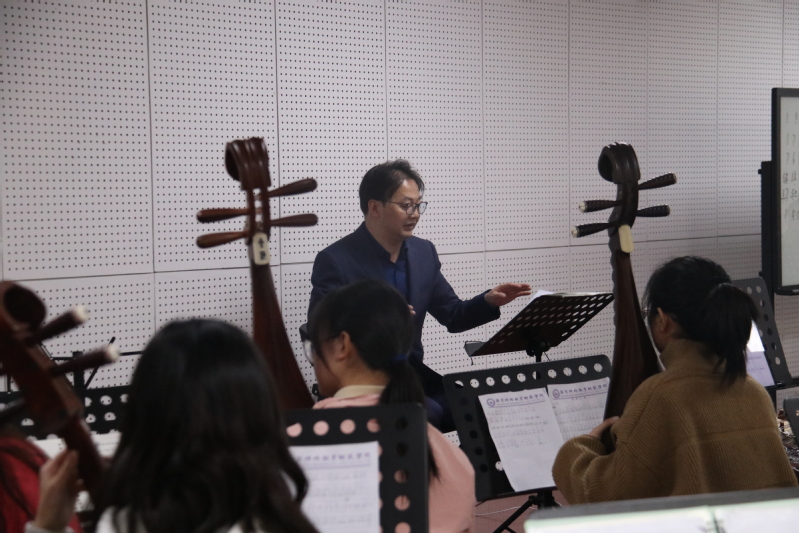 召唤教授认真聆听了公司民乐团演奏的作品,对同学们的演奏给予肯定和表扬,同时指出了乐团演奏在对音乐作品的本体理解、音乐性、二度创作和艺术性处理等相关层面上问题。召教授为大家悉心指导了《花好园月》这首作品。他幽默风趣的语言、细腻精准的细节处理、饱满热情的指挥风格不断引起同学们的热烈掌声。他还亲自上阵,为同学们进行乐器示范,使公司师生领略到他极高的艺术造诣和对民族艺术“爱与执着”的崇高精神风貌。最后,召唤教授为大家阐述了对排练作品进行灵活改编的科学手法,分享了在排练中如何应对节奏、音准、音色统一等常见问题的实用技巧,提出了具有很强指导性、操作性、针对性的建议。召教授的专业、严谨的训练方法为民乐团师生在今后的乐团排练中提供了好经验、好思路、好方法。