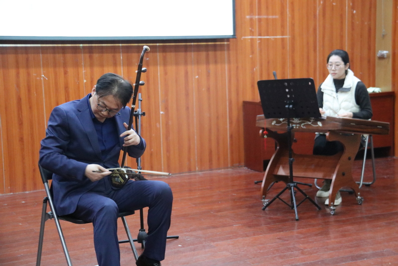 召唤教授还亲自为大家演奏了几首二胡名曲,令在场师生如痴如醉。开场的《苏南小曲》充分体现了中国南方文化所特有的小巧玲珑特点。他将音域的变化和转调巧妙地组合在一起,使整个演奏始终处于精巧伶俐的表演气氛。《江南春色》把人们带到了优美如画的江南水乡,静谧而令人陶醉。全曲的主题音乐,旋律秀丽、柔美,展示了春天的气息,表现了人们内心的喜悦。而《二泉映月》则表现了二胡无限的温柔与凄苦。召唤教授的琴声似水,如同从斑驳的树影中涌出,前尘、往事洒落一地。接着,他又为大家带来了《姑苏春晓》,乐曲描绘了姑苏城早春时分的自然景象,欢快悠扬,甜美抒情,使人仿佛置身于幽曲明净、精巧秀丽的姑苏园林之中。曲目《如来藏》通过音符的跳跃,旋律的流动,节奏的变化与强弱的起伏,表现了其时代性、主旋律以及对人生的探索。