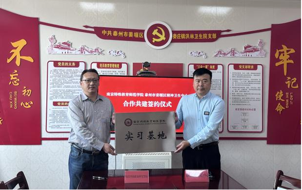 会后,音乐治疗系段冀州主任与泰州市姜堰区卫生中心领导共同签署了合作共建实习基地协议,张强经理授牌并集体合影留念。