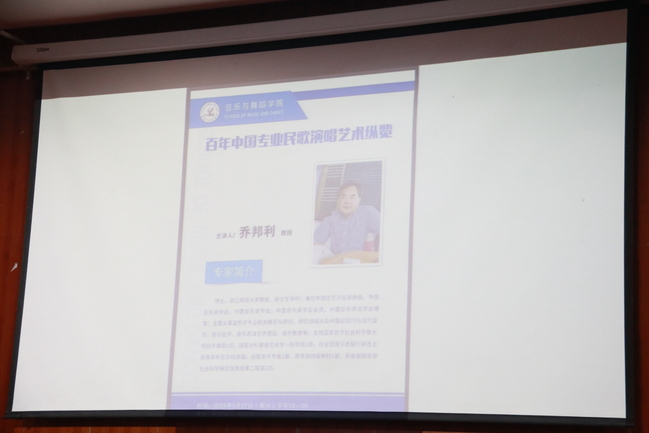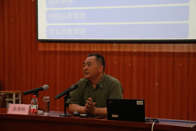 乔教授从民歌的地位引入展开此次讲座。他强调,民歌是中国民族优秀文化的重要组成部分,民歌演唱在民歌传承与发展中具有不可替代的作用,并结合民歌的相关概念界定阐述了传统民歌演唱与专业民歌演唱的关系。