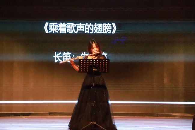 音乐会由朱佳培同学的《乘着歌声的翅膀》开场,这首歌是门德尔松于1836年创作而成的,随着清亮的长笛声,一幅温馨而富有浪漫主义色彩的图景在我们眼前缓缓展开, 一切都像笼上了一层轻柔的淡雾,飘逸在诗人所创造的这个神奇的世界里,这一切都融入歌声里、梦幻中,把在场的观众们都带到了恬静、纯净,充满诗意的东方。朱思源和王敏吉同学带来的《红梅花儿开》,傲雪红梅历来被我们歌颂为不屈的象征。