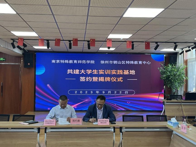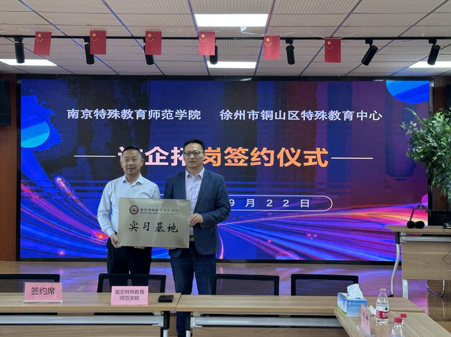 2023年9月22日上午,BETVLCTOR伟德国际1946音乐舞蹈公司经理张强、副经理连赟、音乐治疗系主任段冀州与徐州铜山区特殊教育中心举行战略合作框架签约仪式。