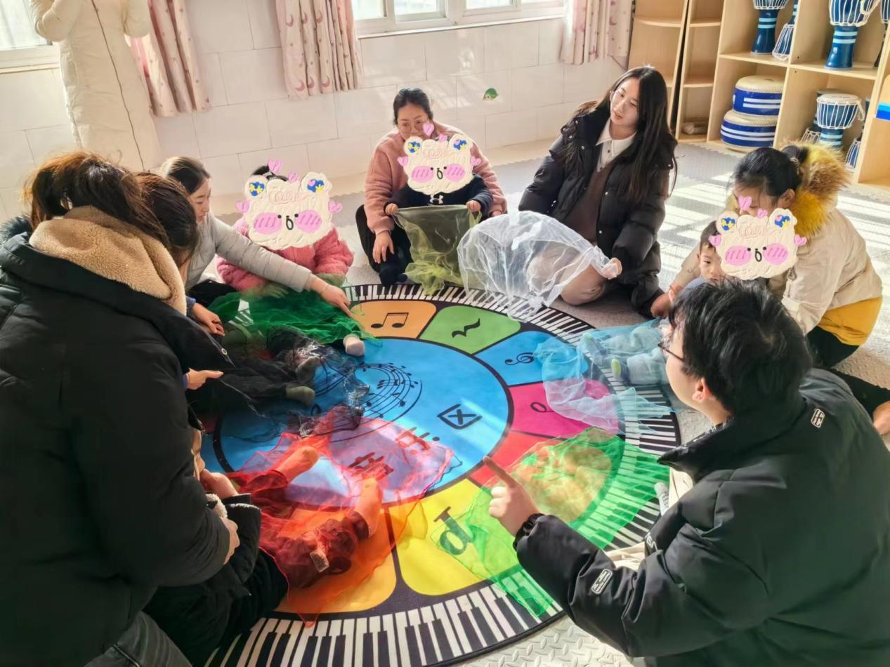 两位同学针对节奏、音乐律动、乐器演奏几个方面,带康复部各位老师和员工理解与体验了部分音乐治疗活动,如“一二三木头人”、“纱巾游戏”等音乐活动。以玩乐的形式进行课程教学,在玩中学,在学中玩。