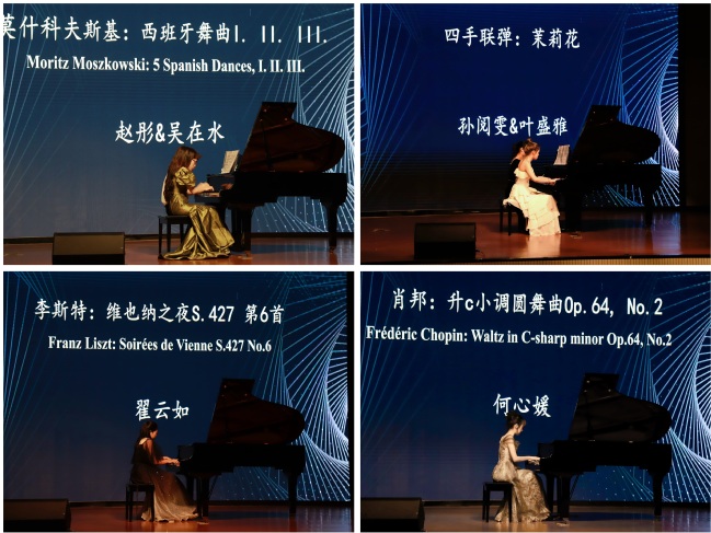 下半场,中国作品与四手联弹环节更是亮点纷呈。厉晶晶与吴亚伦合作的四手联弹《彩云追月》展现出独特的东方韵味,赵彤与吴在水演奏的莫什科夫斯基《西班牙舞曲第1、2、3首》充满了节日的活力与激情,叶盛雅演奏的《春舞》带领我们走近新疆丰收季节的热闹场面。王艺嫱的民歌弹唱串烧:《唱支山歌给党听》、《唱离愁》、《梁祝新歌》赢得阵阵掌声。孙阅雯与叶盛雅合作的四手联弹《茉莉花》清新脱俗、灵动优雅,熟悉的旋律余音绕梁......