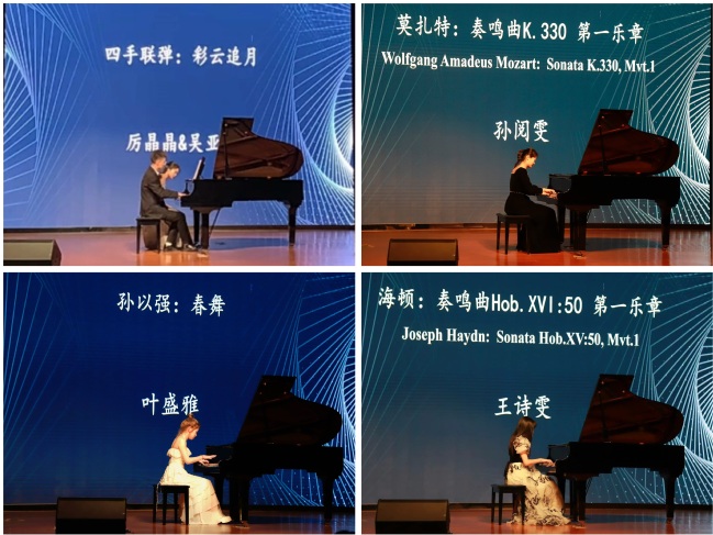 上半场的演出中,一首首经典曲目依次奏响。赵彤以德彪西的《为钢琴而作:第一首前奏曲》为音乐会拉开序幕,随后吴在水、张雨晴等同学也分别演奏了门德尔松的《幻想曲Op.28第一乐章》、德沃夏克的《精灵之舞Op.85, no.8》等经典曲目,让观众沉浸在美妙的音乐世界中。翟云如演奏的李斯特《维也纳之夜S.427第6首》、何心媛的肖邦《圆舞曲Op.64, no.2》让我们领略其中的优雅与浪漫,孙阅雯的莫扎特《奏鸣曲K.330第一乐章》展现出莫扎特音乐的灵动与童真,王诗雯演奏的海顿《奏鸣曲Hob.XVI:50第一乐章》呈现出古典时期严谨、典雅的音乐风采。
