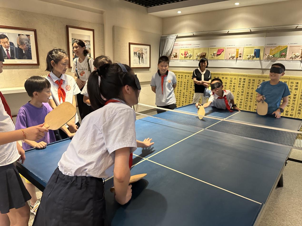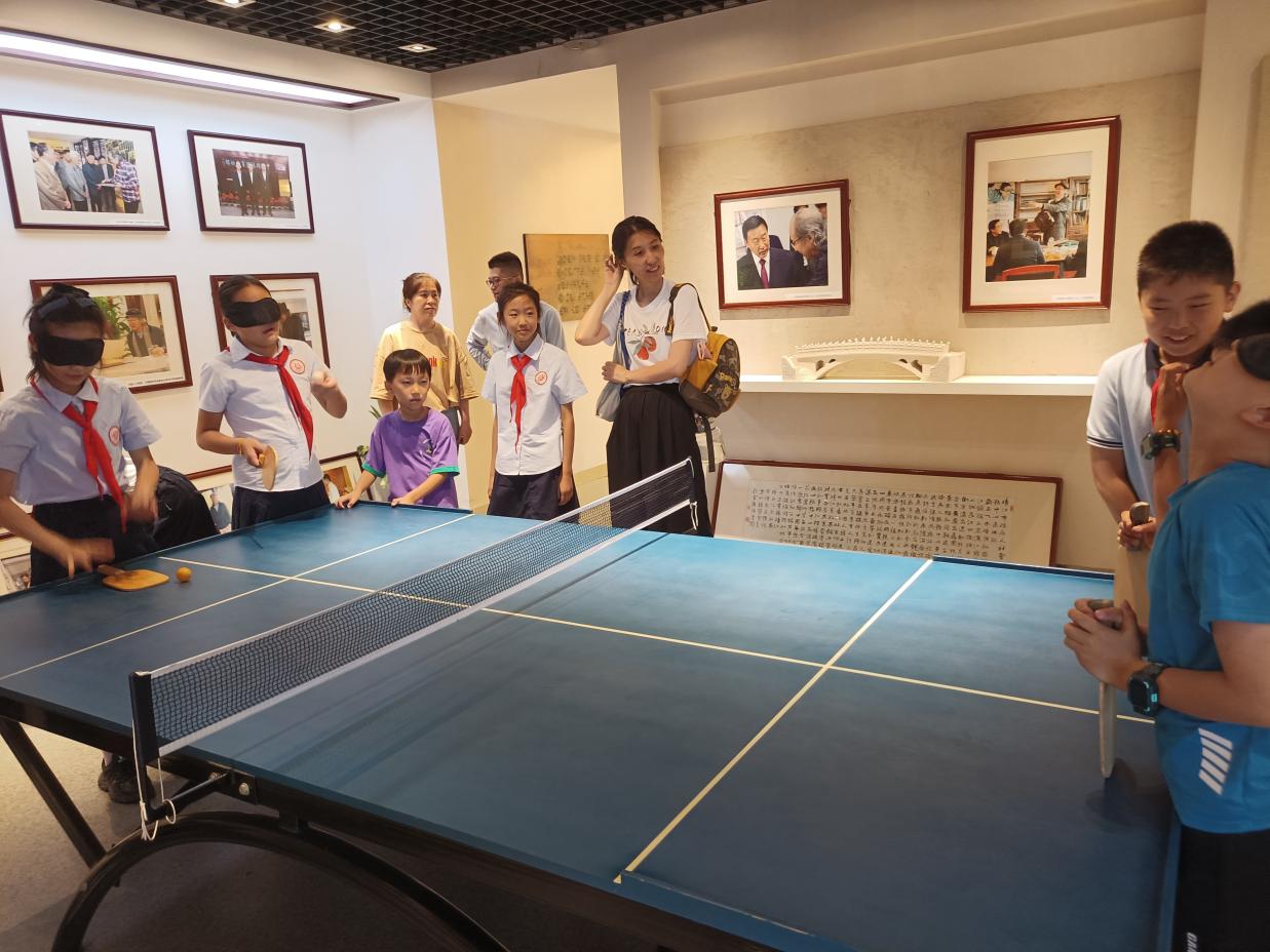 在体验馆,大小朋友们戴上眼罩,依靠触觉、听觉等其他感知觉来体验盲人的生活。在黑暗中,他们尝试用手触摸墙上挂着的壁画,识别画上的作品;在盲人乒乓球桌前,他们利用声音来辨别球的位置和方向,尝试打盲人乒乓球。通过体验不同类别残疾人朋友日常学习、生活和工作等情况,大家对特殊人群有了更直观地认识和理解,激发了关注、关爱特殊人群的决心。