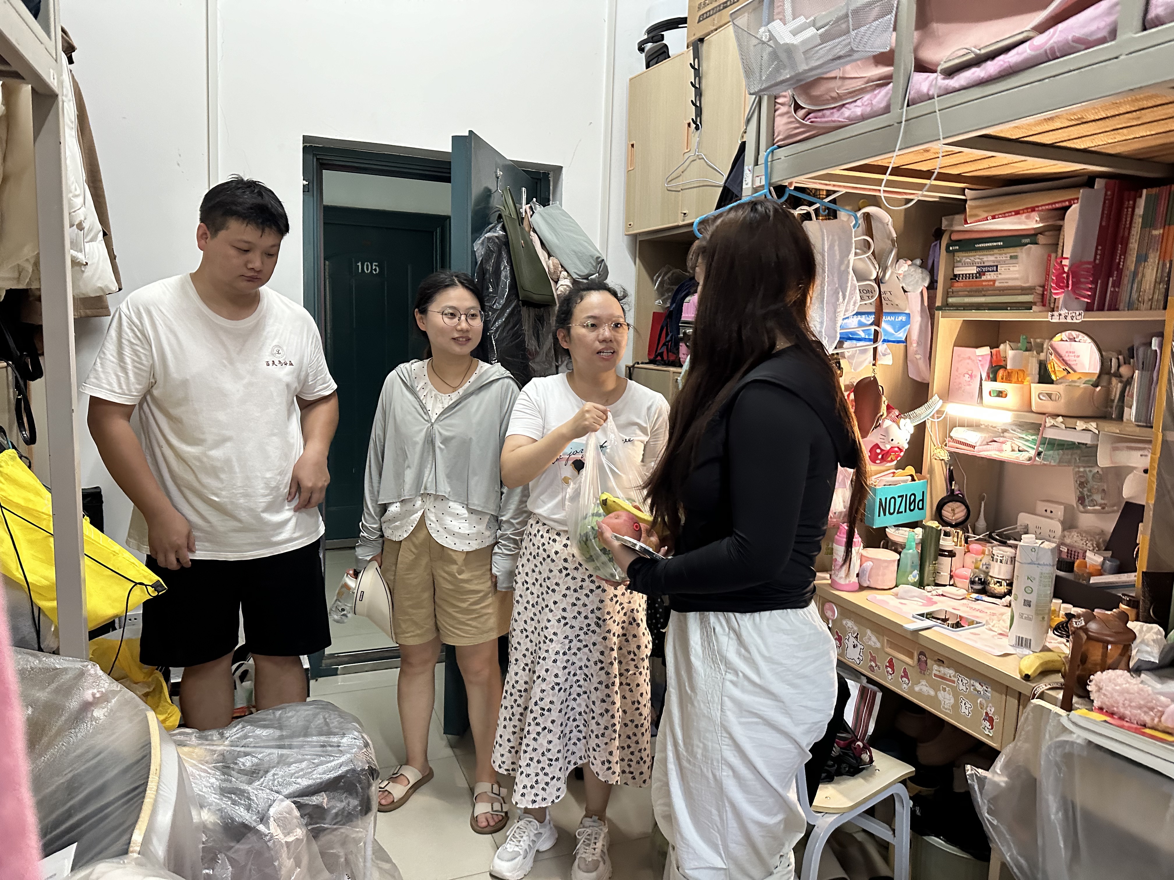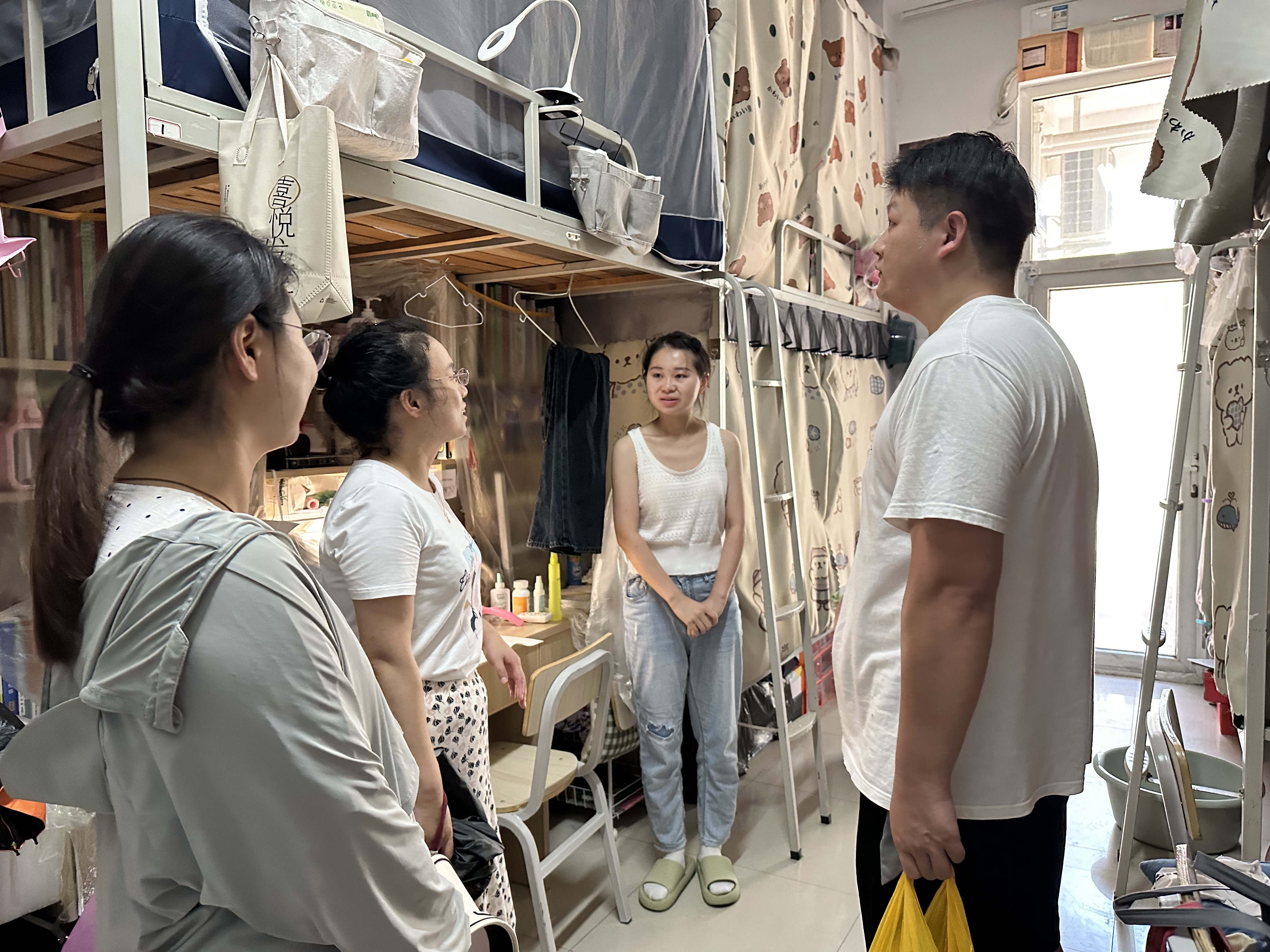 走访慰问过程中,徐琴书记一行与留校员工亲切交流,深入了解留校期间员工学习和生活情况,提醒员工饮食健康卫生、夏日防暑和宿舍消防安全,叮嘱员工注意人身安全和财产安全,每日按时打卡报平安,有任何困难均可随时联系辅导员,并为员工送上水果消暑解渴。