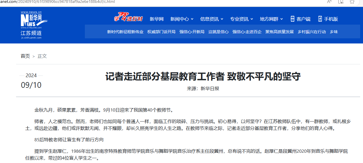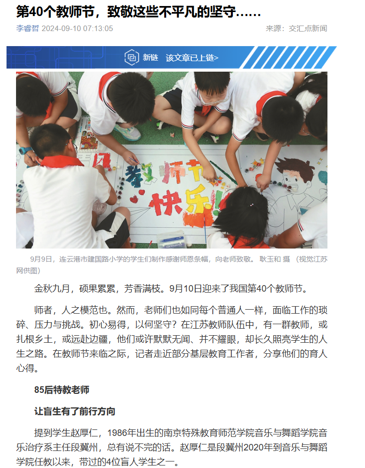 教师节之际,新华日报、交汇点新闻等多家媒体对公司段冀州老师事迹进行报道,受到社会各界广泛关注。