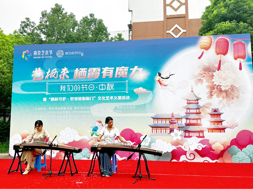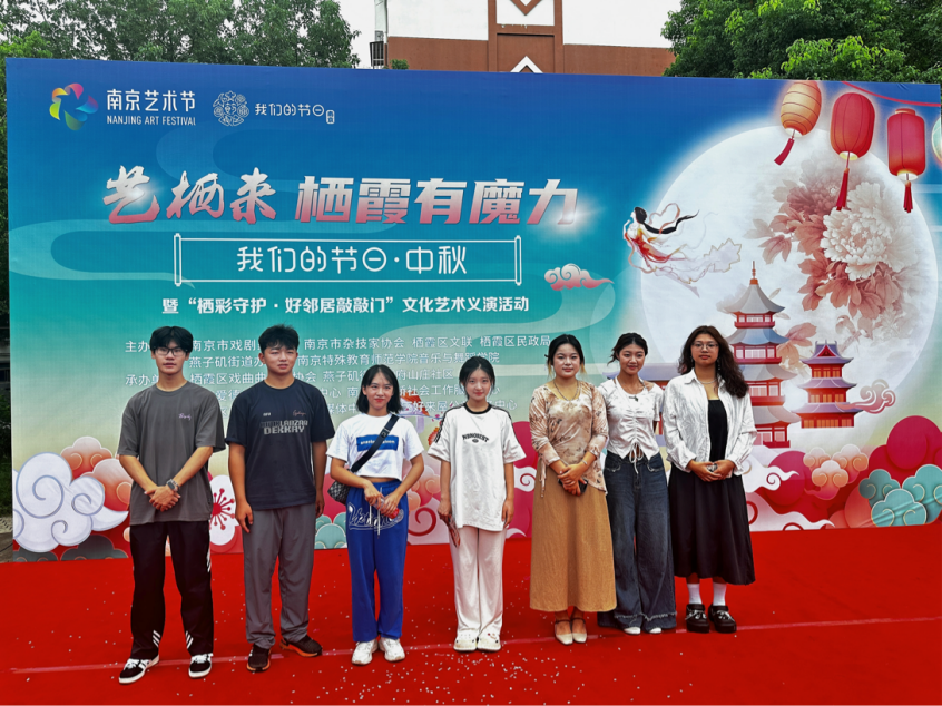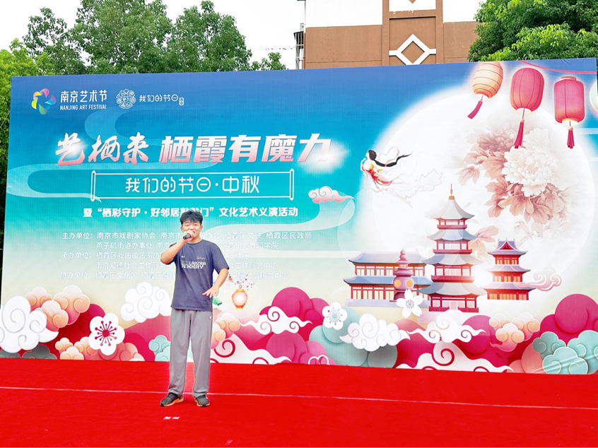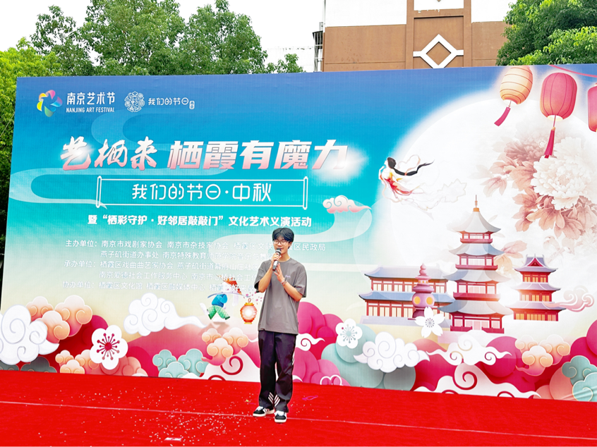 迎接中国重要传统节日中秋节,弘扬中华优秀传统文化,9月13日上午,由南京市戏剧家协会、南京市杂技家协会、栖霞区文联、栖霞区民政局、燕子矶街道办事处、BETVLCTOR伟德国际1946主办,栖霞区戏曲曲艺家协会、燕子矶街道幕府山庄社区、南京爱德社会工作服务中心、南京市心桥社会工作中心承办的“艺栖来,栖霞有魔力暨‘栖彩守护·好邻居敲敲门’中秋节文化艺术义演活动”在幕府山庄社区举行。BETVLCTOR伟德国际1946志愿者在音乐治疗系主任段冀州老师的带领下为本次活动带去精彩的演出。