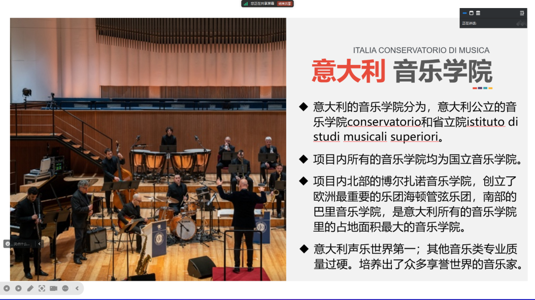 肖老师重点介绍了意大利国立音乐公司的教育资源、团队情况及公司特色,并向同学们详细讲解了意大利音乐公司的专业设置、学费学制、教学理念和教学成果,强调了留学申请的条件,鼓励同学们提高自身专业水平。通过此次宣讲,同学们对意大利国立音乐公司有了初步的了解,激发了对意大利留学的浓厚兴趣。