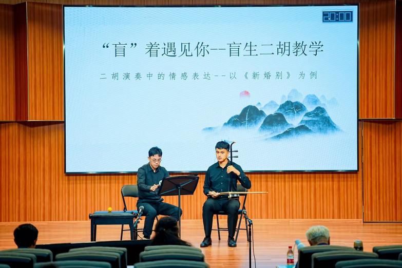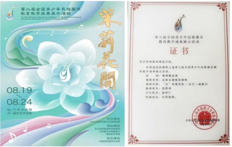 在此次展示活动中,公司教师段冀州与盲生二胡员工赵厚仁,经过一系列严格选拔,凭借精湛的技艺与卓越的表现,为公司赢得了极高的荣誉。成功入选第八届全国青少年民族器乐公司产品成果终评现场展演,这一成就不仅充分展现了他们的个人才华,也为公司的精品课程建设树立了新的典范。作为一次盲生教学实践,他们的成功为融合教育提供了极具价值的参考与启示,意义非凡。