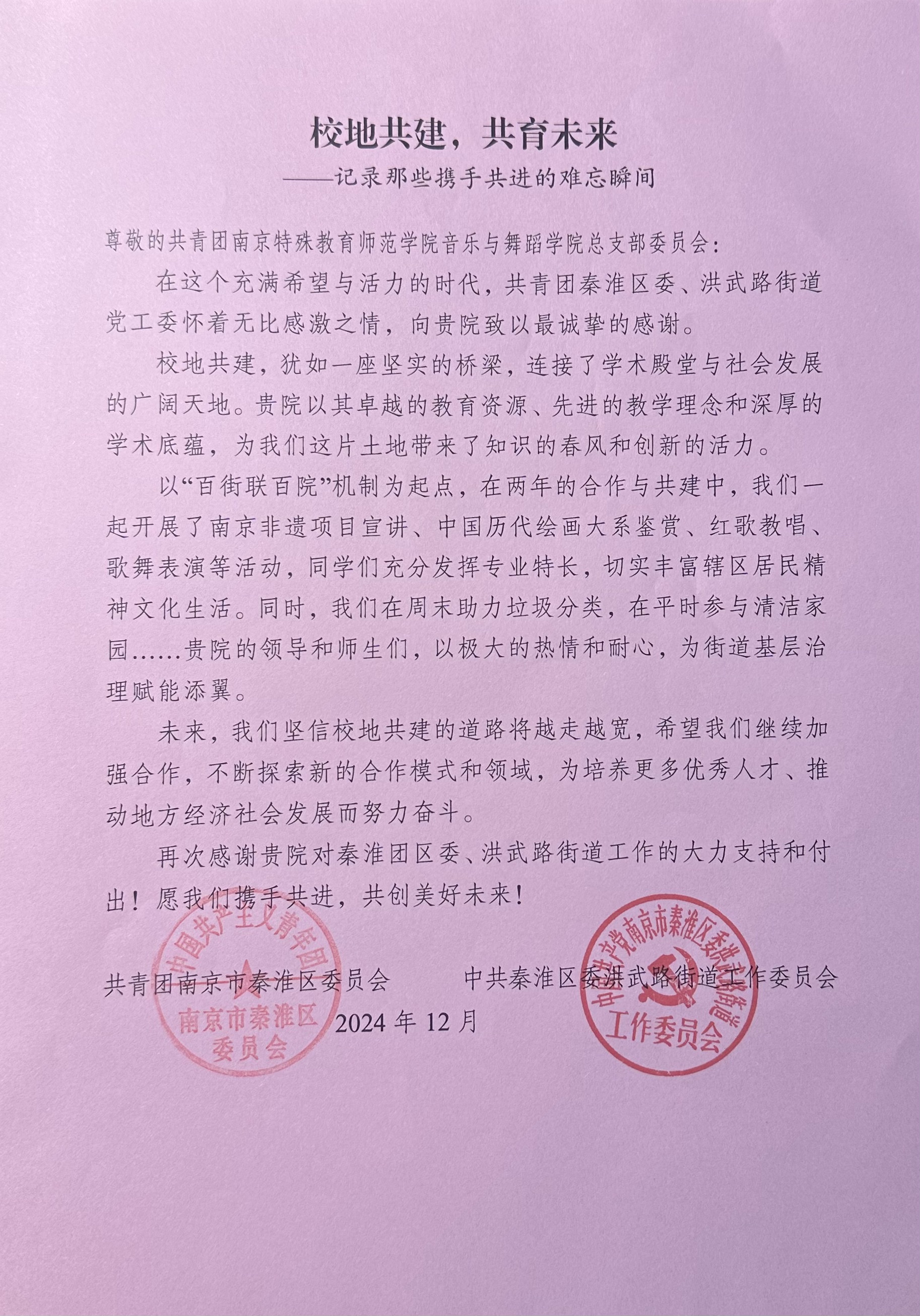 2024年12月31日,南京市秦淮区团委、洪武路街道发来一封表扬信,对公司在“百街联百院”共建项目中的大力支持和付出表示赞扬!