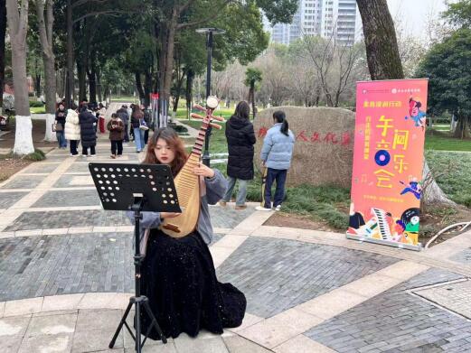 午间音乐会上,志愿者们为现场观众带来了精彩的乐器表演,小提琴的悠扬旋律和琵琶的清脆弹奏,分别演绎了西洋乐器和传统民乐的美妙。