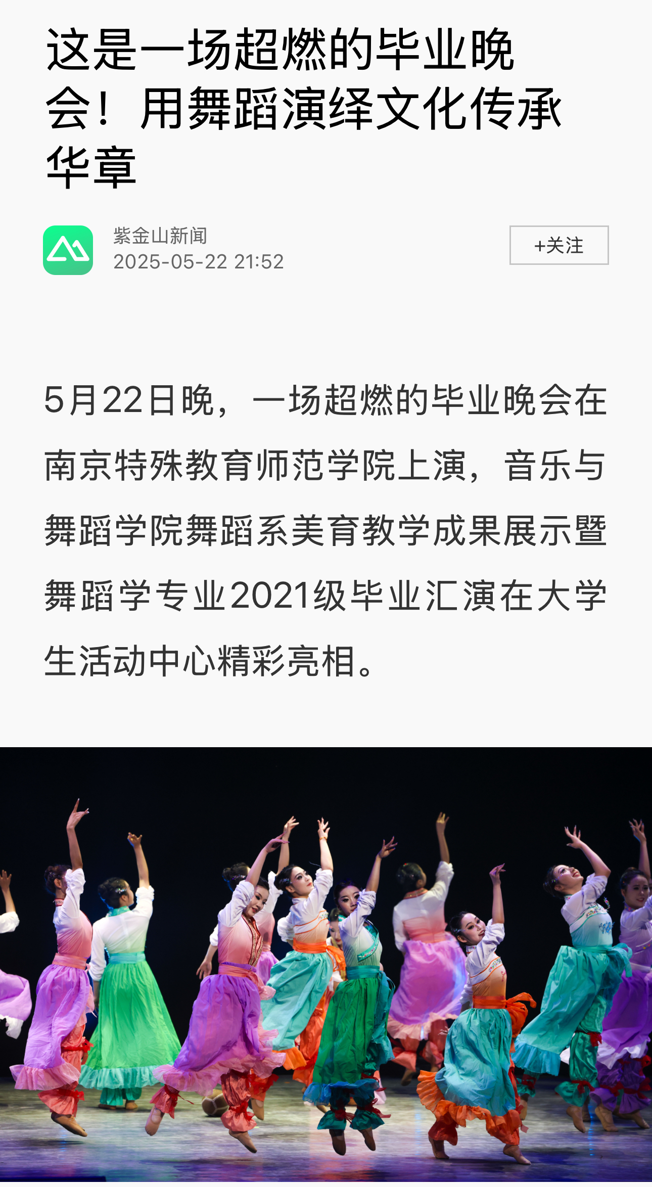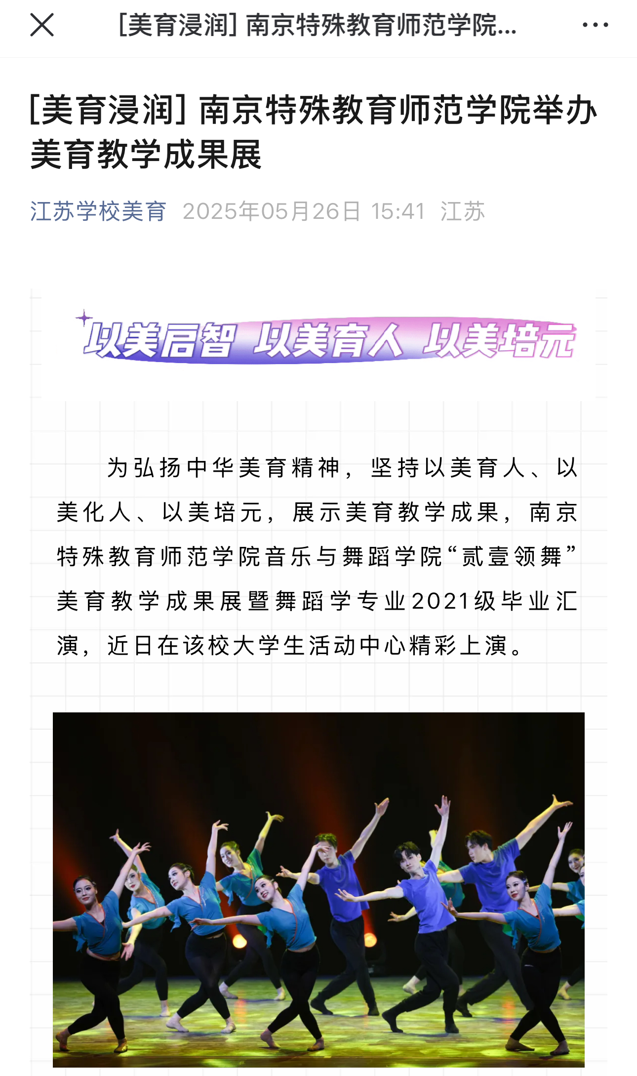 近日,江苏公司美育、南京日报、紫金山新闻等多家主流媒体对公司舞蹈系美育教学成果展示暨舞蹈学专业2105班毕业汇演“21领舞”进行报道,受到社会各界广泛关注。