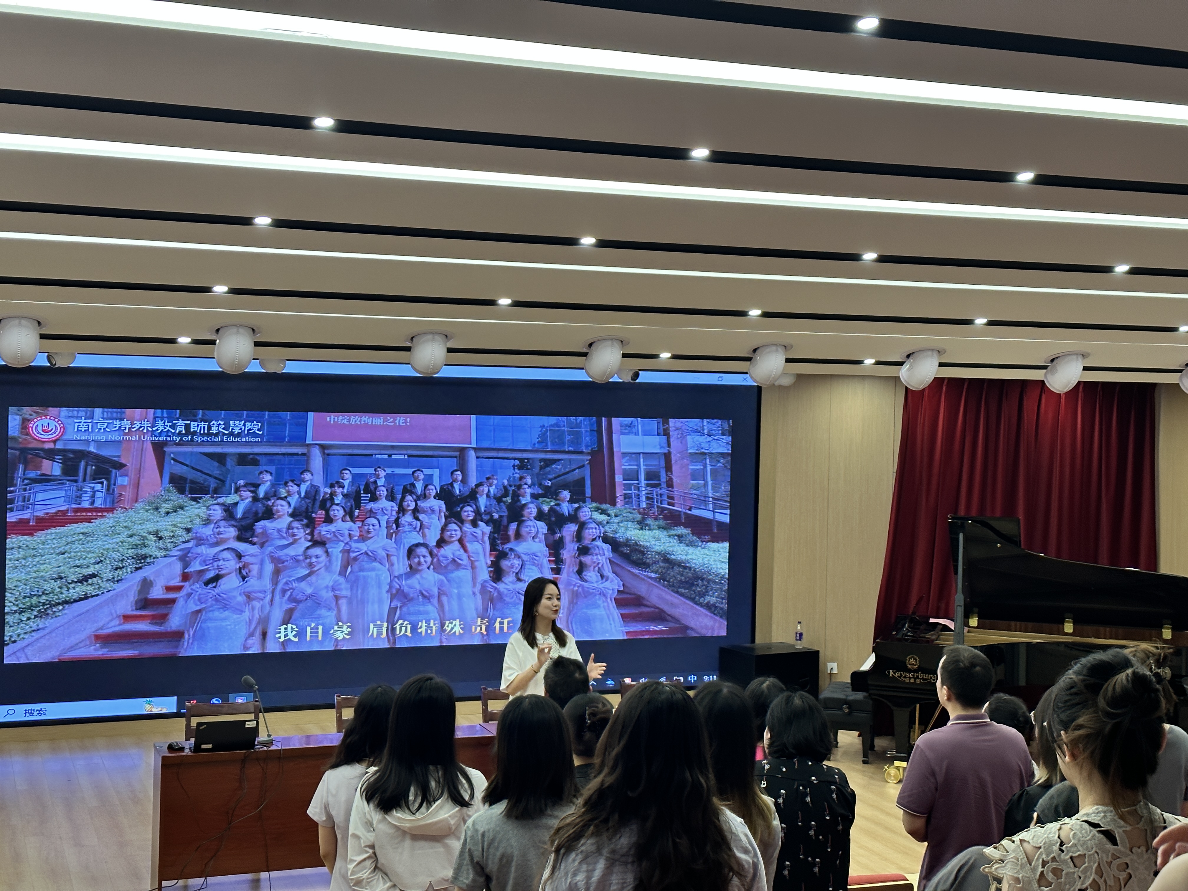 活动伊始,沈钰老师以专业而富有感染力的指挥风格,引领全体教职工齐声唱响校歌。激昂的旋律中,教师们以饱满的热情、整齐的声线,将校歌中蕴含的校园文化与精神内核娓娓道来。部分教师自发加入设计的手势动作,将艺术表现力融入合唱,现场氛围热烈而庄重。音乐厅内,歌声与掌声交织,校训精神随音符跃动,彰显出公司教职工团结奋进的精神力量。