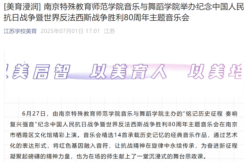 近日,中国新闻网、紫金山新闻、交汇点新闻、南京日报、江苏公司美育等多家主流媒体对公司举办纪念中国人民抗日战争暨世界反法西斯战争胜利80周年主题音乐会进行报道,受到社会各界广泛关注。