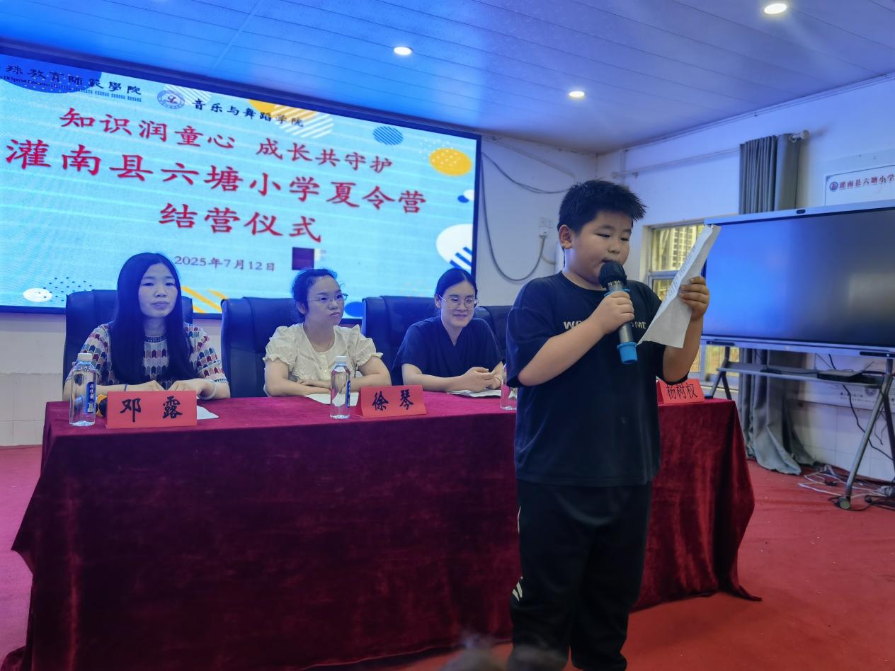 员工代表孙耀扬同学上台分享了他在夏令营的所得所想,感谢各位老师教他们用音乐倾诉情感、用手语比画爱意、用舞蹈表达自己、用剪刀剪出春天,用粘土捏出梦想、用漂流瓶装满未来。支教代表马子余老师分享了与孩子们相处的点滴感动,支教是双向奔赴的温暖旅程,在这个旅程中,他们深刻体会了教育的价值和意义。李小婷局长在总结中高度赞扬了活动的社会意义,并呼吁更多社会力量加入乡村振兴的行列,关注乡村教育发展。